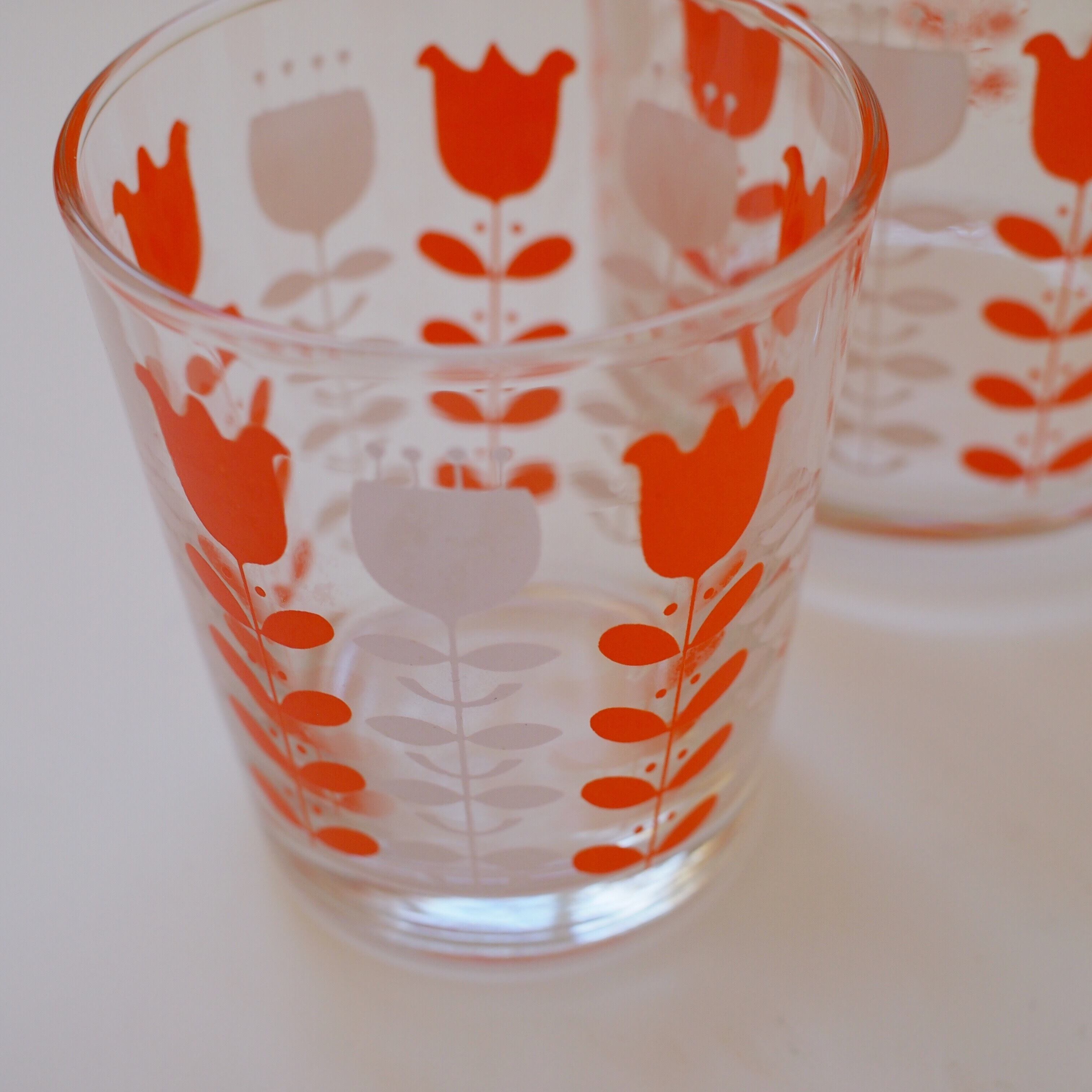 ヴィンテージの水差しとグラスのセットです。白とオレンジのチューリップの模様が北欧アンティークっぽくてかわいいです。古いものですがデッドストックの新品ですので気持ちよく使っていただけます。