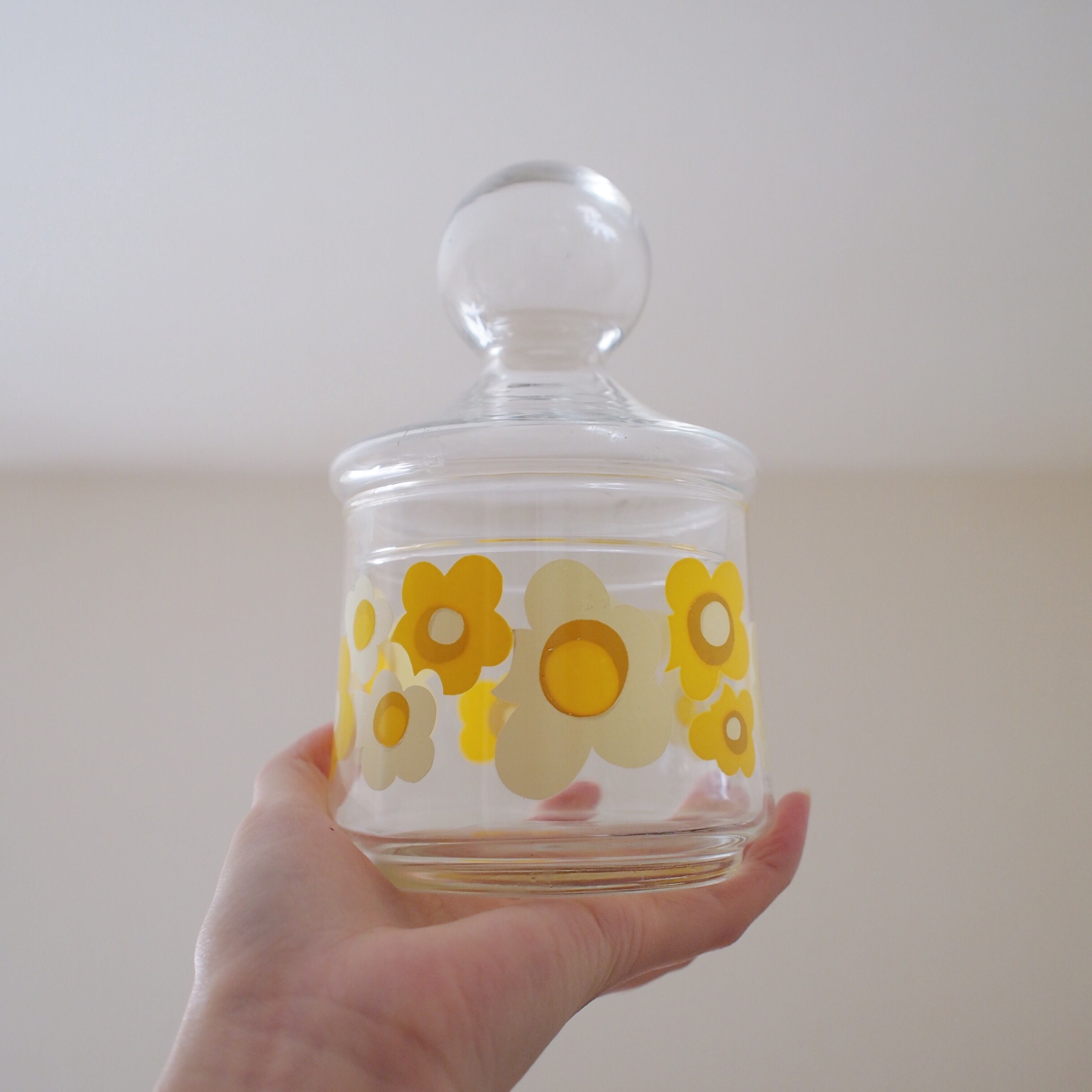 ヴィンテージの花柄ガラスキャニスターです。デッドストックの新品です。マリメッコみたいな北欧風の花柄がかわいい。