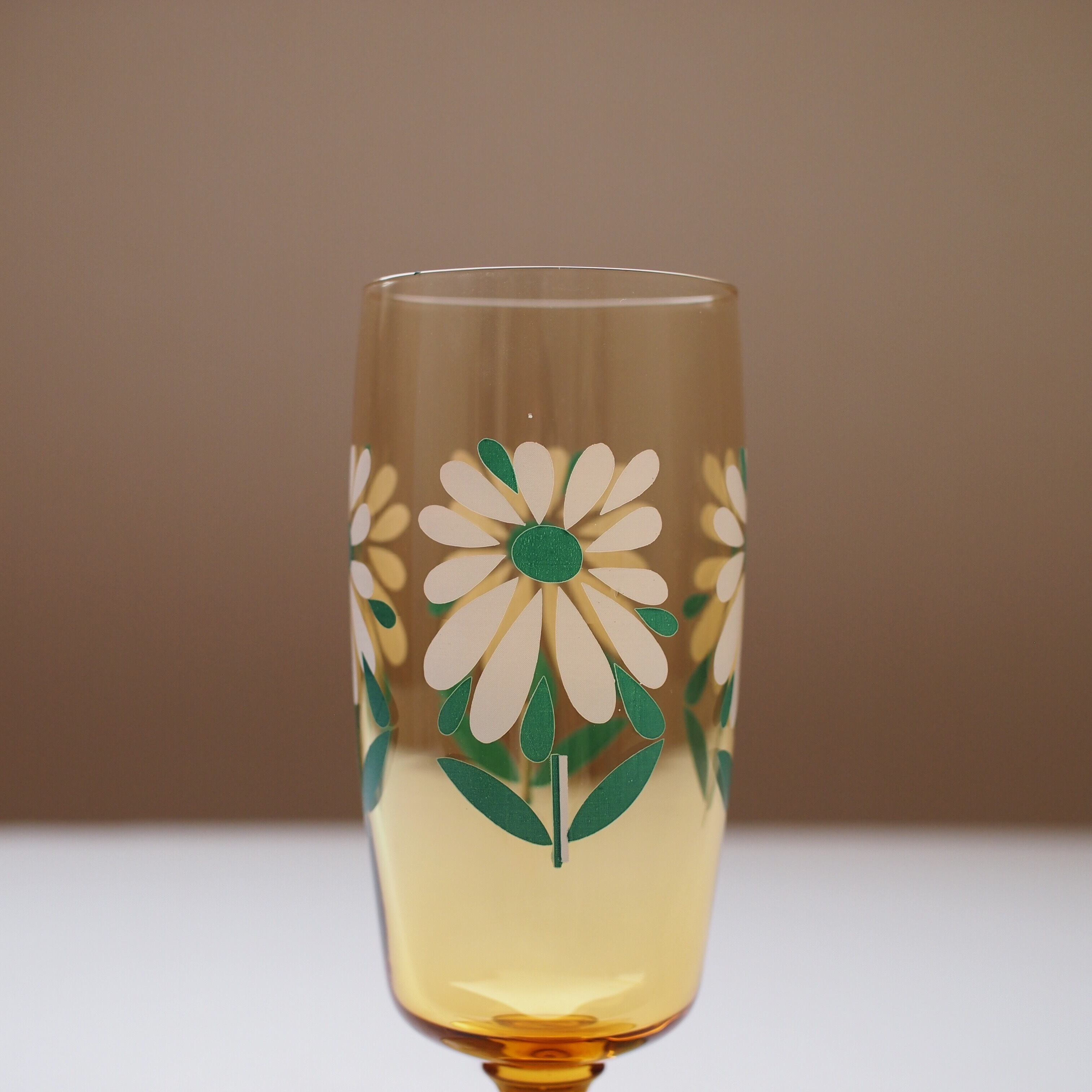 ヴィンテージの古い脚付きグラスです。ノスタルジックな琥珀色(アンバーブラウン)は、上に向かって薄くなってゆくほんのりグラデーション。白と青緑の花柄が、フランスアンティークや北欧アンティークみたいな雰囲気でかわいいです。アラビア イッタラ お好きな方にもおすすめ。古いものですがデッドストックの新品ですので気持ちよく使っていただけます。
