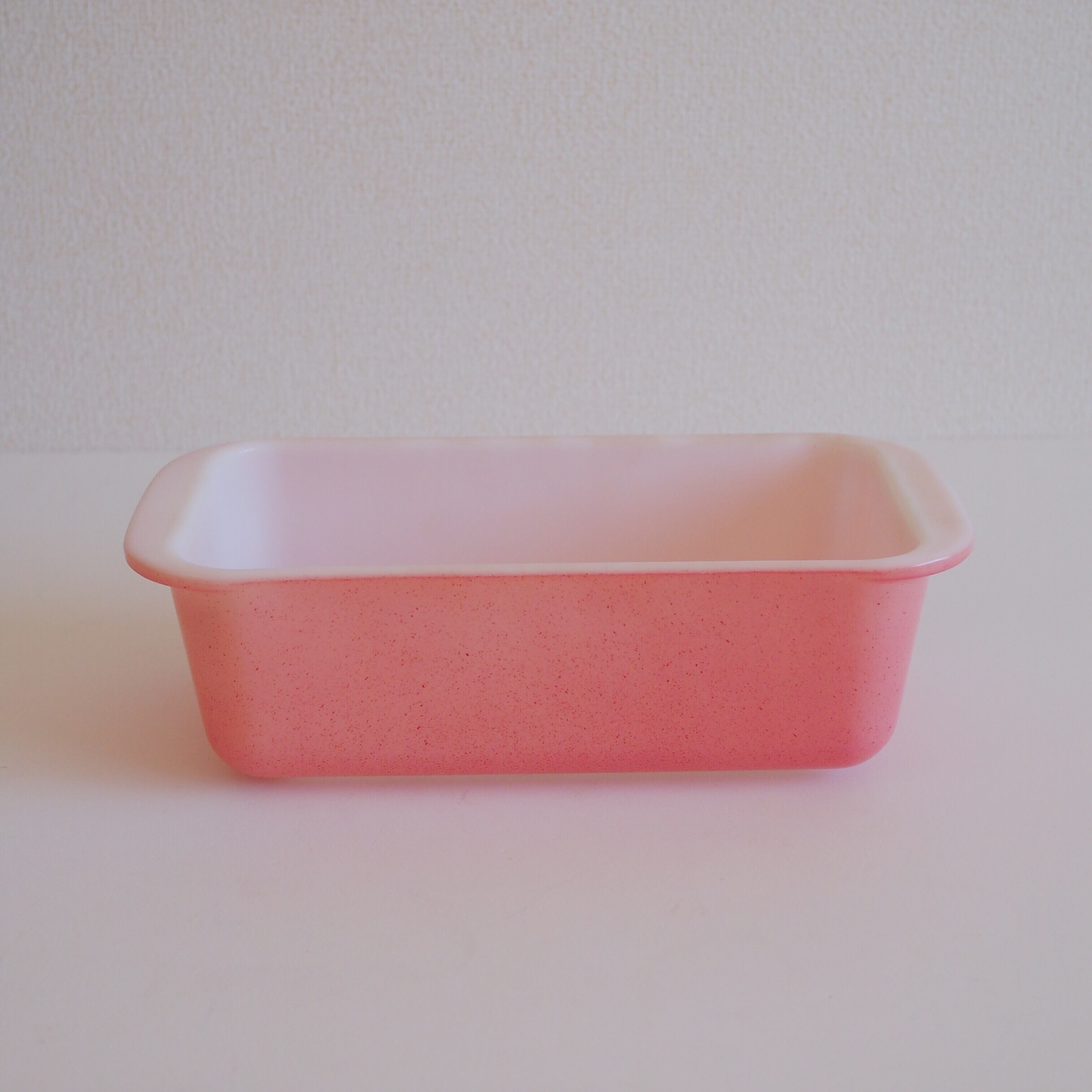 オールドパイレックスのパウンドケーキ型です。いちごをすり潰したスムージーみたいなつぶつぶ模様のピンクで、とても珍しいお品です。滅多にお目にかかることはないと思います。乳白色のミルクガラスにピンクのペイントがかわいいです。