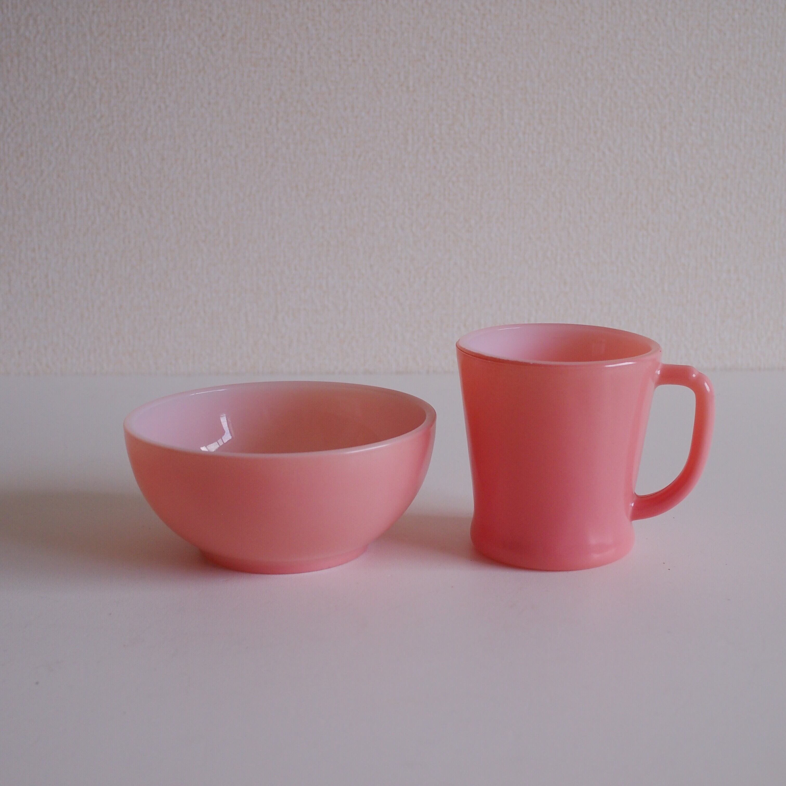 ファイヤーキングのDハンドルマグカップとチリボウルのセットです。とってもかわいい希少カラーのピンク。色味やコンディションのよく似たものをセットで出品しています。ヒビやカケは見当たりません。