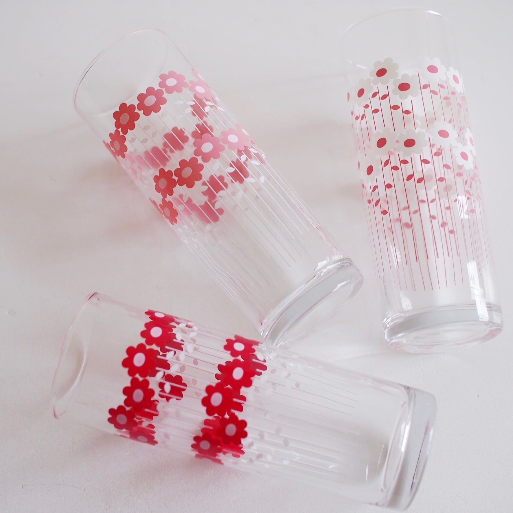 ヴィンテージの花柄グラス3つセットです。北欧っぽい花柄がかわいい。アデリアガラス製のもので、大変めずらしいピンク系の花柄です。こちらは生産数が非常に少なく、滅多にお目にかかれない貴重なものです。この時代はオレンジや黄色などの昭和レトロポップな花柄は多かったのですが、ピンク系はかなりめずらしいです。デッドストックの新品です。バラ売りはしません。