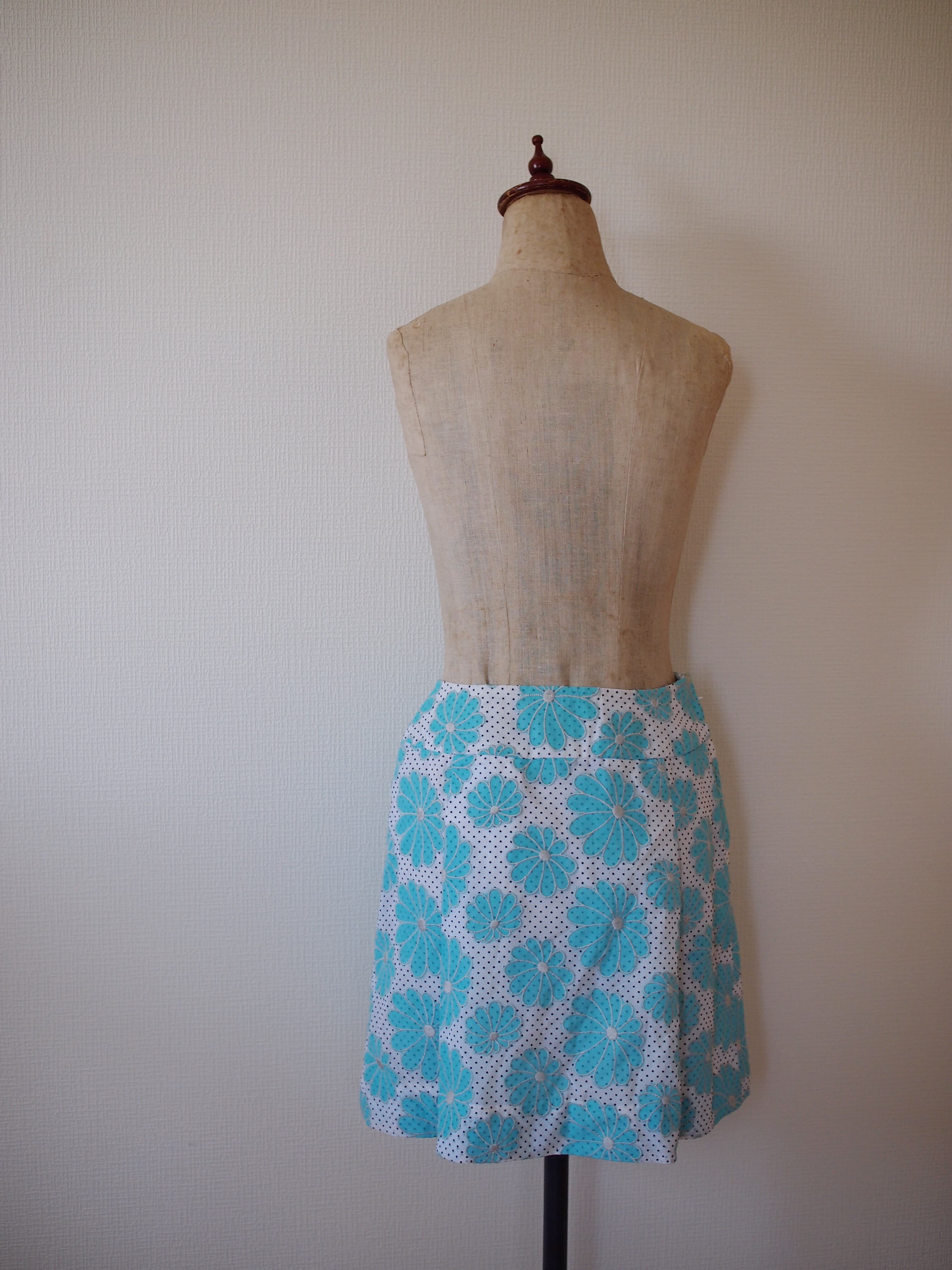 1960年代から1970年代のヴィンテージスカート。レトロな水色の花柄がかわいい。こちらはオリジナルの一点もので、世界に1枚だけのスカートです。透け防止の裏地もしっかりと付いており、おそらく素人による制作では無く、デザイナーもしくは仕立て屋などプロが制作したものと思われます。